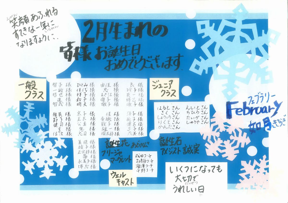 今月誕生日のスクール生の皆様へ 2月生まれの皆様 お誕生日おめでとうございます。 季節の節目、節分、立春と、春の足音、暖かくなる嬉しさの中で、行動的で、ロマンにあふれ繊細さを持ち合わせているイメージの2月生まれさん。 素敵な1年をお過ごしください。 コメントは受け付けていません。